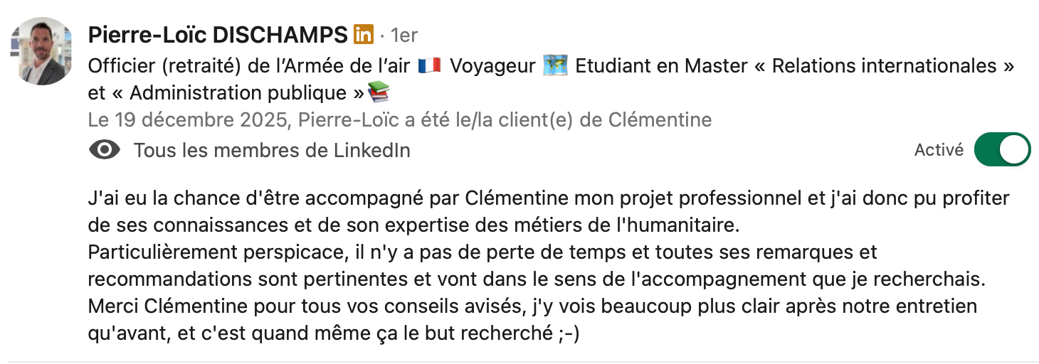 En 30 minutes, je vous aide à identifier les pistes humanitaires réellement adaptées à votre profil — ou à celui de la personne que vous accompagnez. Pour candidats en doute comme pour proches en quête de clarté. Réservez votre séance et repartez avec une lecture professionnelle, directe et actionnable.